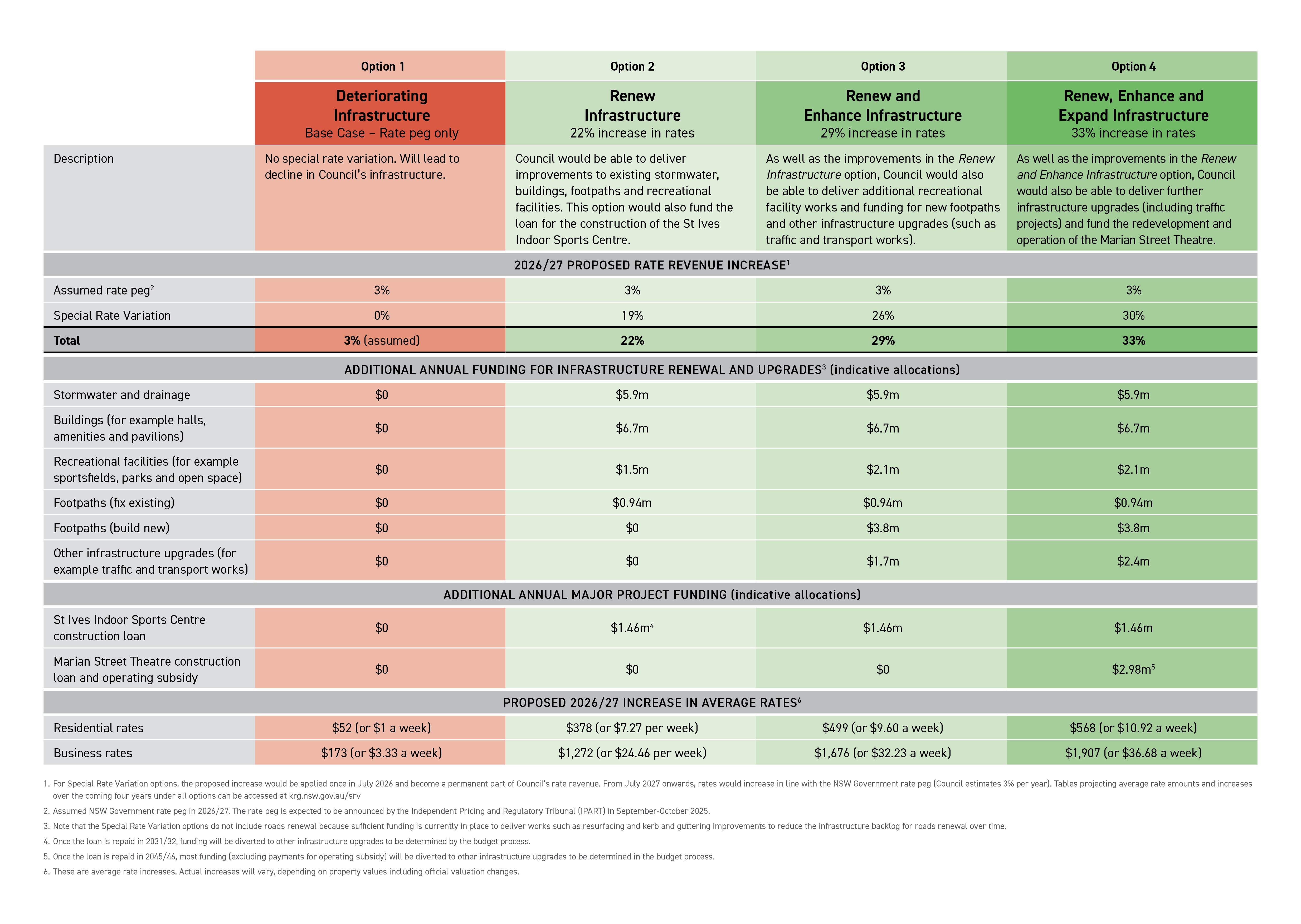 Three of these options would involve a permanent increase in rates above the NSW Government’s rate revenue peg to fund a range of infrastructure improvements.